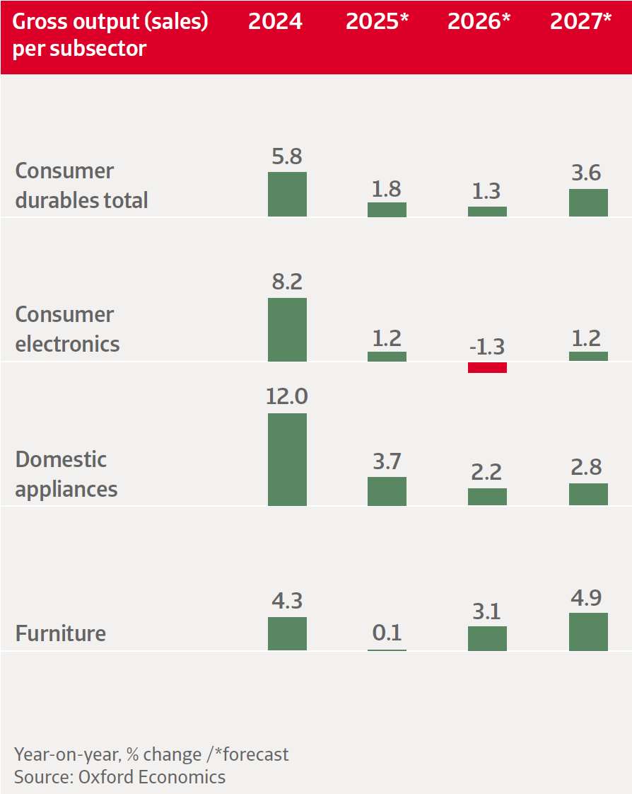 - Après une hausse de 5,8 % en 2024, la croissance mondiale des ventes de biens de consommation durables devrait ralentir à 1,8 % en 2025, puis à 1,3 % en 2026.