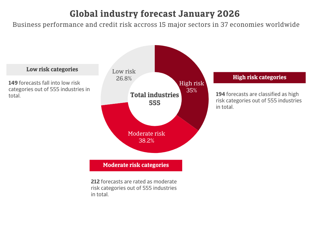 Au total, 555 prévisions ont été émises : 149 relèvent de catégories à faible risque, 212 sont classées comme présentant un risque modéré et une part importante, 194 est classée comme présentant un risque élevé. Les prévisions pour l'alimentation, les produits pharmaceutiques, les services financiers, les produits chimiques, l'électronique/les TIC et l'agriculture sont plus favorables que la référence globale. Les machines/l'ingénierie et les services restent à des niveaux de risque moyens. Les transports, l'automobile, les biens de consommation durables et le papier présentent un risque élevé. Les perspectives les plus négatives se concentrent dans les secteurs de la construction, des métaux/acier et du textile.