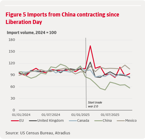 Au terme d'une phase de négociations intenses, la politique commerciale américaine est entrée dans une période de relative stabilité. L'administration a continué à utiliser les droits de douane, ou la menace de les appliquer, comme levier politique, mais le taux effectif des droits de douane est resté relativement stable. Au cours de cette phase, l'administration a de plus en plus recouru à des exemptions ciblées pour les secteurs sensibles tels que l'informatique et les produits alimentaires, dans le but explicite d'alléger la pression sur les prix pour les consommateurs américains. Cela a contribué à une légère baisse du taux effectif des droits de douane, qui est tombé à 10,7 %, les entreprises ayant délocalisé leur production et renégocié leurs relations avec leurs fournisseurs.