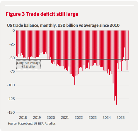 Le déficit commercial reste historiquement élevé et volatil, reflétant d’autres tendances sous-jacentes telles que les effets de prix, l’essor des investissements dans l’IA ainsi que l’anticipation des achats. Il est donc trop tôt pour conclure que les droits de douane se sont révélés inefficaces pour réduire le déficit commercial, mais l’expérience observée jusqu’à présent corrobore les résultats de la recherche empirique. Les recherches du FMI estiment que les effets de la hausse des droits de douane sur la balance commerciale sont faibles et insignifiants, tant à court qu'à long terme. L'impact limité à court terme résulte principalement d'effets de prix, tandis que l'impact sur le volume est faible et différé, les entreprises ayant besoin de plusieurs années pour reconfigurer leurs chaînes d'approvisionnement. Une étude de la Réserve fédérale sur les droits de douane de 2018-2019 montre également que les effets sur les quantités importées ne sont apparus qu'après 12 à 18 mois, se concentrant dans les secteurs ciblés et étant largement compensés par la substitution d'autres fournisseurs, ce qui a laissé le déficit global des États-Unis inchangé. Si l'on examine l'évolution du déficit commercial américain dans la figure 3, l'absence de réduction durable renforce l'idée que toute correction structurelle devrait prendre des années avant d'être visible.