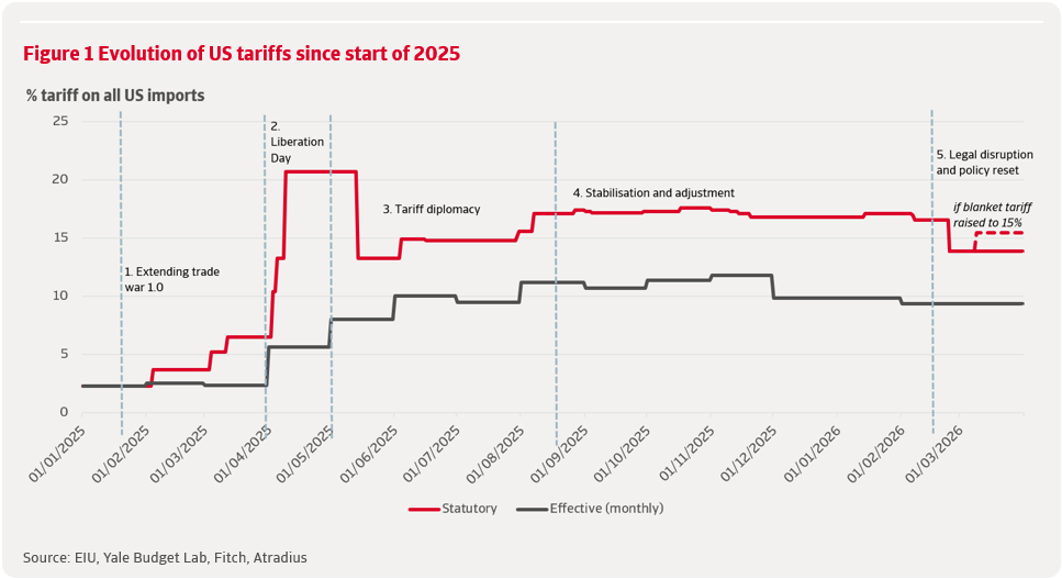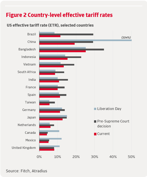 Une décision de la Cour suprême rendue fin février 2026 a invalidé la plupart des droits de douane instaurés à titre d'urgence, soit environ 75 % de l'ensemble des droits de douane américains. Le gouvernement a réagi en instaurant un droit de douane universel temporaire en vertu de l'article 122 de la loi sur le commerce de 1974, remplaçant l'ancien régime tarifaire spécifique à chaque pays par une surtaxe à l'importation uniforme. Si la structure s'est simplifiée, le taux tarifaire légal reste fixé à 13,9 %, soit six fois plus élevé qu'avant le début de l'escalade. Fitch estime que cela n'a fait baisser que légèrement le taux tarifaire effectif, à 9,4 %.