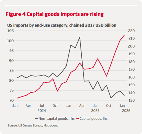 La persistance de la demande intérieure américaine a limité l'impact du renforcement des barrières commerciales sur le volume global des importations. Cela apparaît particulièrement clairement lorsque l'on examine la composition des importations. L'essor des investissements liés à l'IA a soutenu une forte demande d'importations de produits de haute technologie associés à l'IA et aux centres de données, malgré la hausse des prix. Les importations de biens d'équipement – notamment les ordinateurs, les semi-conducteurs et les accessoires – ont connu une forte progression tout au long de l'année. En janvier 2026, les importations de biens d'équipement étaient supérieures de 16 % à la moyenne de 2025, tandis que les importations de biens non capitalisables affichaient une tendance à la baisse après une forte hausse anticipée avant le Jour de la Libération (graphique 4).