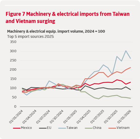 Les machines et équipements électriques ont été la principale source de résilience des importations depuis l'escalade de la guerre commerciale, avec des volumes en hausse d'environ 25 % depuis 2024. Les importations en provenance de Chine, qui était auparavant le fournisseur dominant, ont chuté à moins de la moitié de leur niveau de 2024. Ce recul a été plus que compensé par la hausse des importations en provenance d'autres économies asiatiques, notamment de Taïwan, dont les exportations sectorielles vers les États-Unis ont presque triplé, et du Vietnam, où elles ont doublé. Le Mexique s'est imposé comme le premier fournisseur global, ses importations dépassant désormais d'environ 32 % leur niveau de 2024, ce qui reflète à la fois les exemptions tarifaires et le réacheminement des chaînes d'approvisionnement (graphique 7).