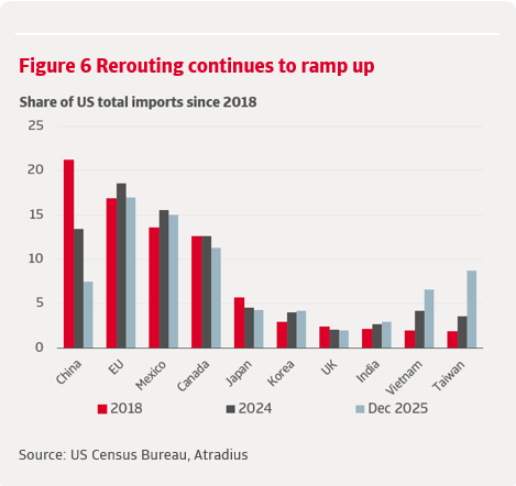 Cette tendance reflète la situation observée depuis 2018 et met en évidence une limite majeure de l'extension des droits de douane dans le cadre de la « guerre commerciale 2.0 ». Alors que les échanges directs entre les États-Unis et la Chine ont fortement chuté, l'empreinte mondiale de l'industrie manufacturière chinoise a permis aux exportations de réintégrer indirectement le marché américain, sapant ainsi l'efficacité des droits de douane pour réduire la dépendance globale vis-à-vis des importations. La Chine représentait plus de 20 % des importations américaines en 2018, une part qui avait déjà été ramenée à 13,4 % en 2024. Aujourd’hui, un an après le « Jour de la libération », cette part n’est plus que de 7,5 %, soit une baisse de 6 points de pourcentage. Cette baisse a été plus que compensée par une augmentation de 2,4 points de pourcentage de la part de marché du Vietnam, qui atteint désormais 6,7 %, et de 5,2 points de pourcentage de celle de Taïwan, qui s’élève à 8,8 %.