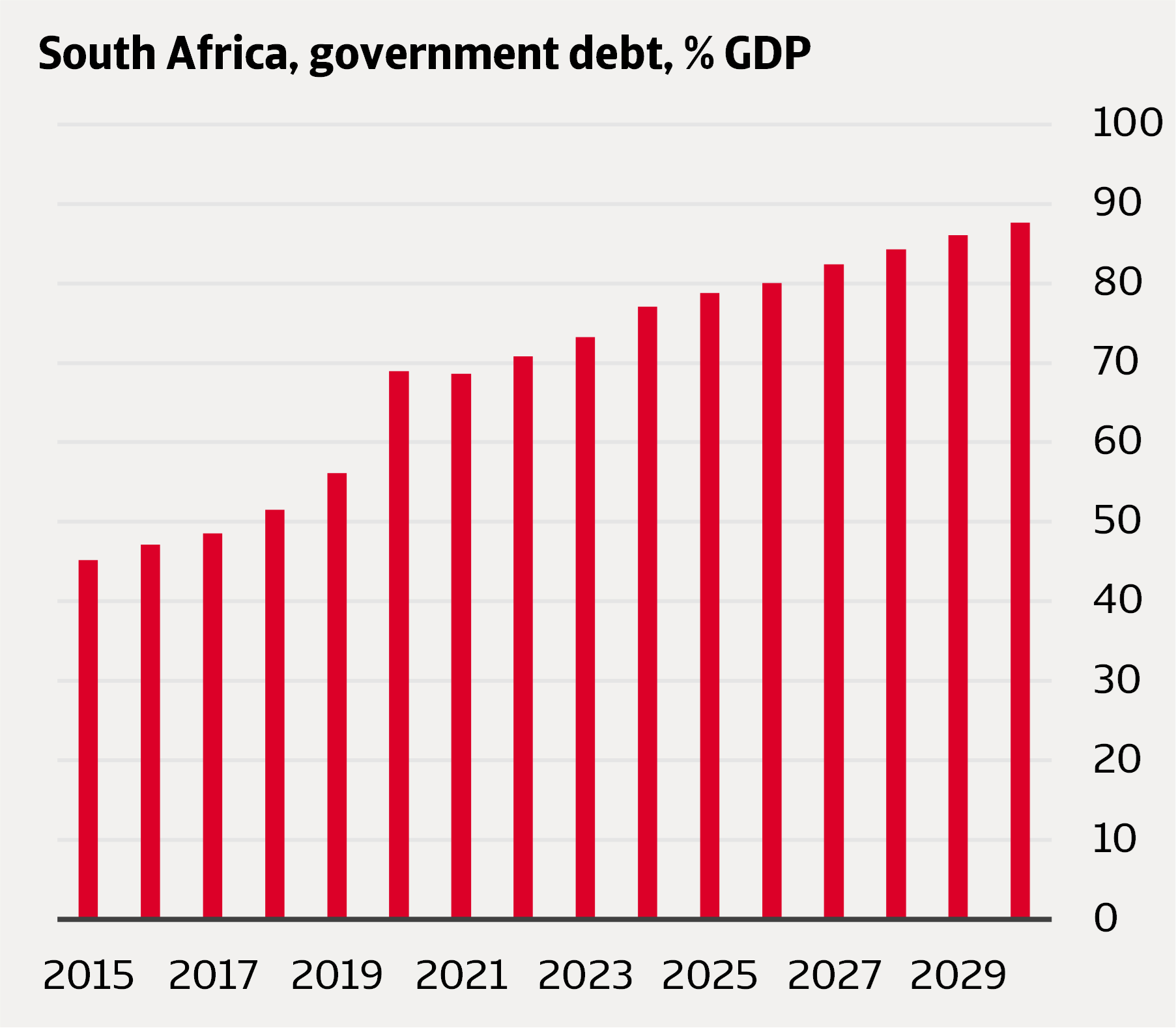 Au cours des dernières années, l'Afrique du Sud a affiché des déficits budgétaires élevés, entraînant une forte augmentation de la dette publique. En 2024, la dette publique totale a atteint 77,3 % du PIB, contre 45,2 % en 2015. La dette publique devrait rester élevée. Bien que le gouvernement d'union nationale se soit engagé à assainir les finances publiques et à maintenir la viabilité de la dette, le ratio dette/PIB devrait se détériorer légèrement dans les années à venir. Cela n'est pas dû à l'augmentation de la dette nominale, mais à la faible croissance économique.
