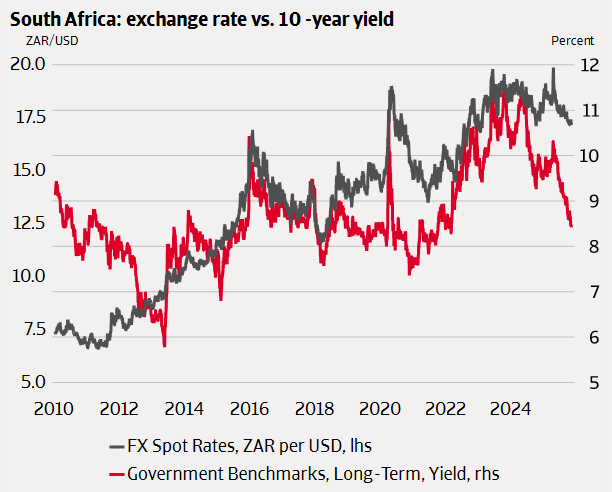 Suite à la formation du GNU, non seulement la confiance des entreprises nationales s'est améliorée, mais aussi le sentiment des marchés financiers. Le rand s'est apprécié, les coûts d'emprunt ont baissé et l'intérêt des non-résidents pour l'achat d'obligations d'État en monnaie locale a augmenté.