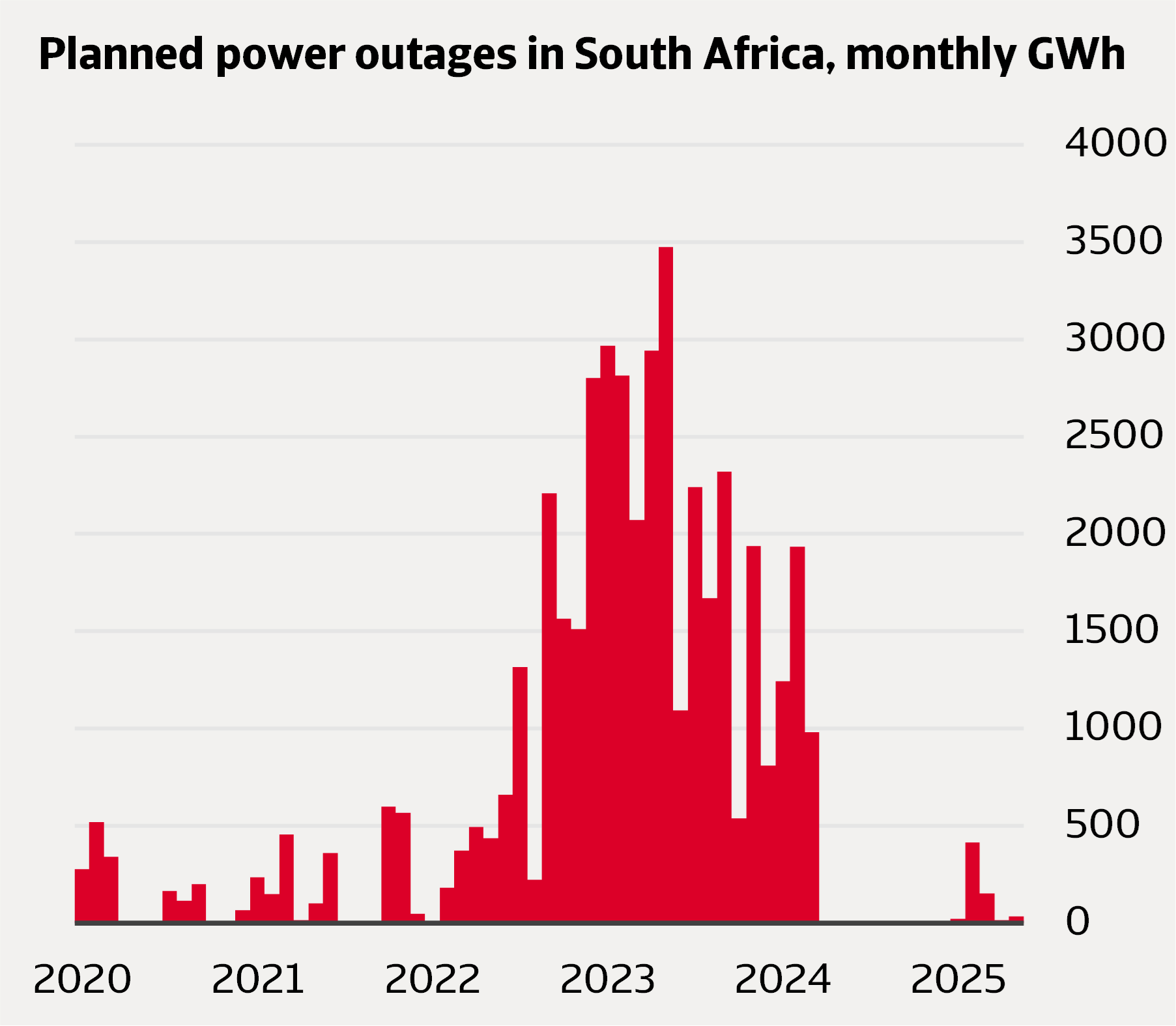 Depuis mars 2024, la fréquence des rationnements d’électricité a diminué. Eskom, une entreprise publique et principal fournisseur d'électricité, a pu remettre en service plusieurs unités de production après une longue période de maintenance. De plus, le secteur privé a investi massivement dans des sources d'énergie alternatives, allégeant ainsi la pression sur le réseau national. Malgré ces améliorations, l'approvisionnement en électricité reste fragile. Les rationnements d’électricité ont brièvement repris au début de l'année 2025, soulignant les vulnérabilités persistantes.