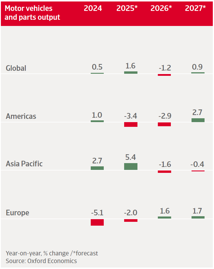- Monde : nous prévoyons une croissance de 1,6 % de la production mondiale de véhicules automobiles et de pièces détachées en 2025, suivie d'une contraction de 1,2 % en 2026. Cette baisse est en partie due aux droits de douane américains.