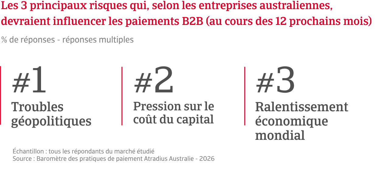 Les entreprises interrogées en Australie expriment une préoccupation grandissante liée à la volatilité des marchés internationaux, les tensions géopolitiques actuelles perturbant fortement les flux commerciaux. L’incertitude quant à l’évolution de la situation exerce une pression supplémentaire sur les chaînes d’approvisionnement. Les coûts d’exploitation devraient rester élevés, tandis que la fiabilité des transports pourrait encore se dégrader dans les mois à venir. Les entreprises anticipent que les perturbations sur les principales routes commerciales continueront d’allonger les délais de livraison et d’accentuer les contraintes logistiques. Ces développements pourraient se traduire directement par une hausse des charges opérationnelles et influencer les priorités de paiement des entreprises. Beaucoup s’attendent à une évolution notable des comportements de paiement B2B dans les mois à venir, les clients ajustant leurs échéanciers en fonction de leur propre niveau de liquidité.