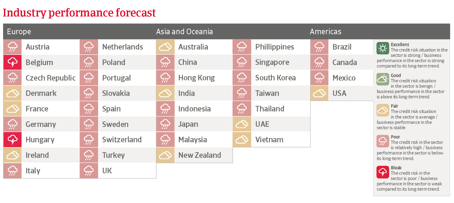 - En Allemagne, la situation du risque de crédit dans l’industrie métallurgique et sidérurgique reste dégradée. Une demande faible, des coûts énergétiques élevés et la pression sur les prix de vente continuent d’éroder les marges.