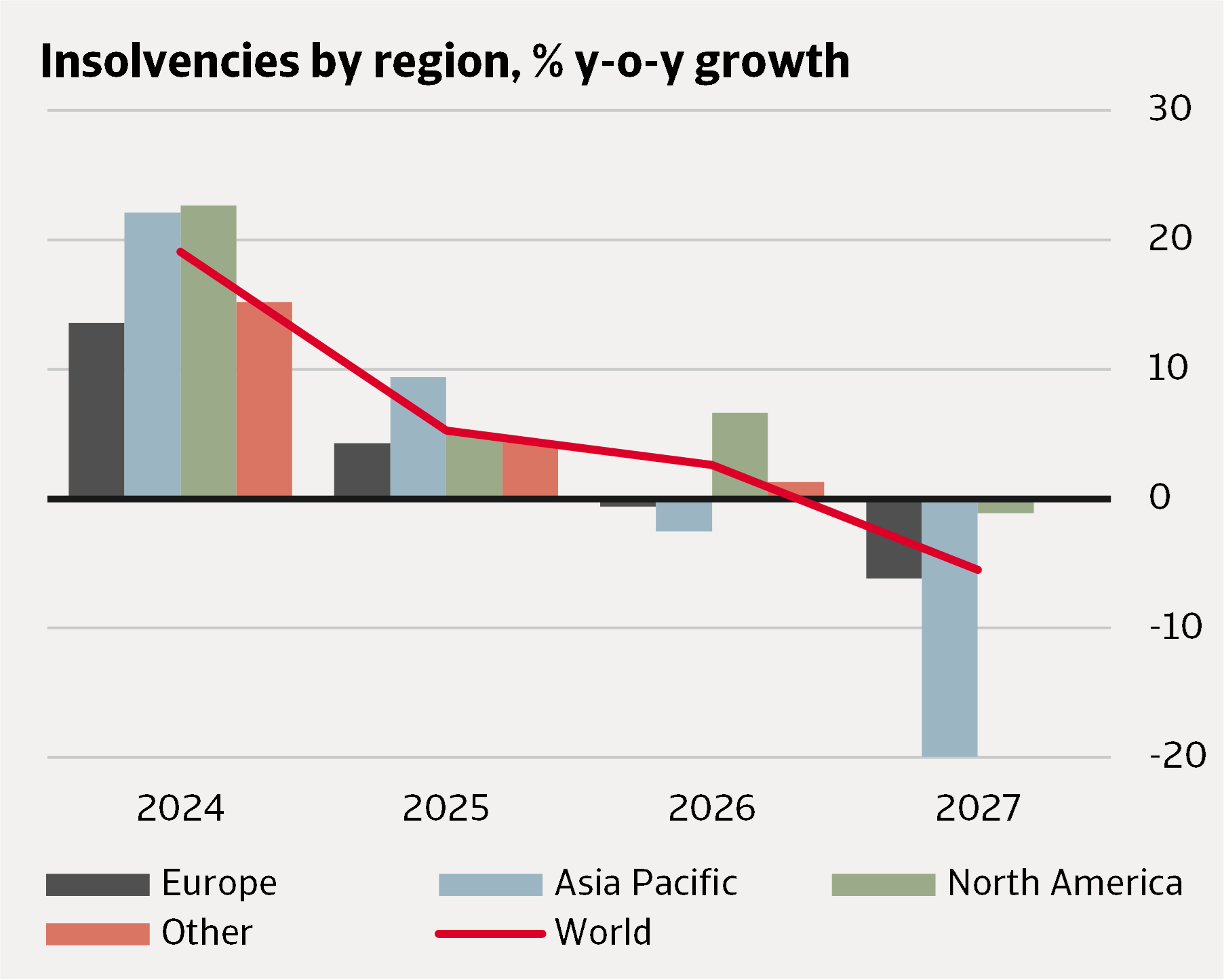 • Pour 2027, nous anticipons un recul mondial des défaillances d’entreprises de 6 %. À l’horizon de l’année prochaine, nous prévoyons une amélioration progressive de l’environnement économique. L’inflation et les prix de l’énergie devraient se normaliser, offrant aux banques centrales une plus grande marge de manœuvre pour assouplir leur politique de taux d’intérêt.
