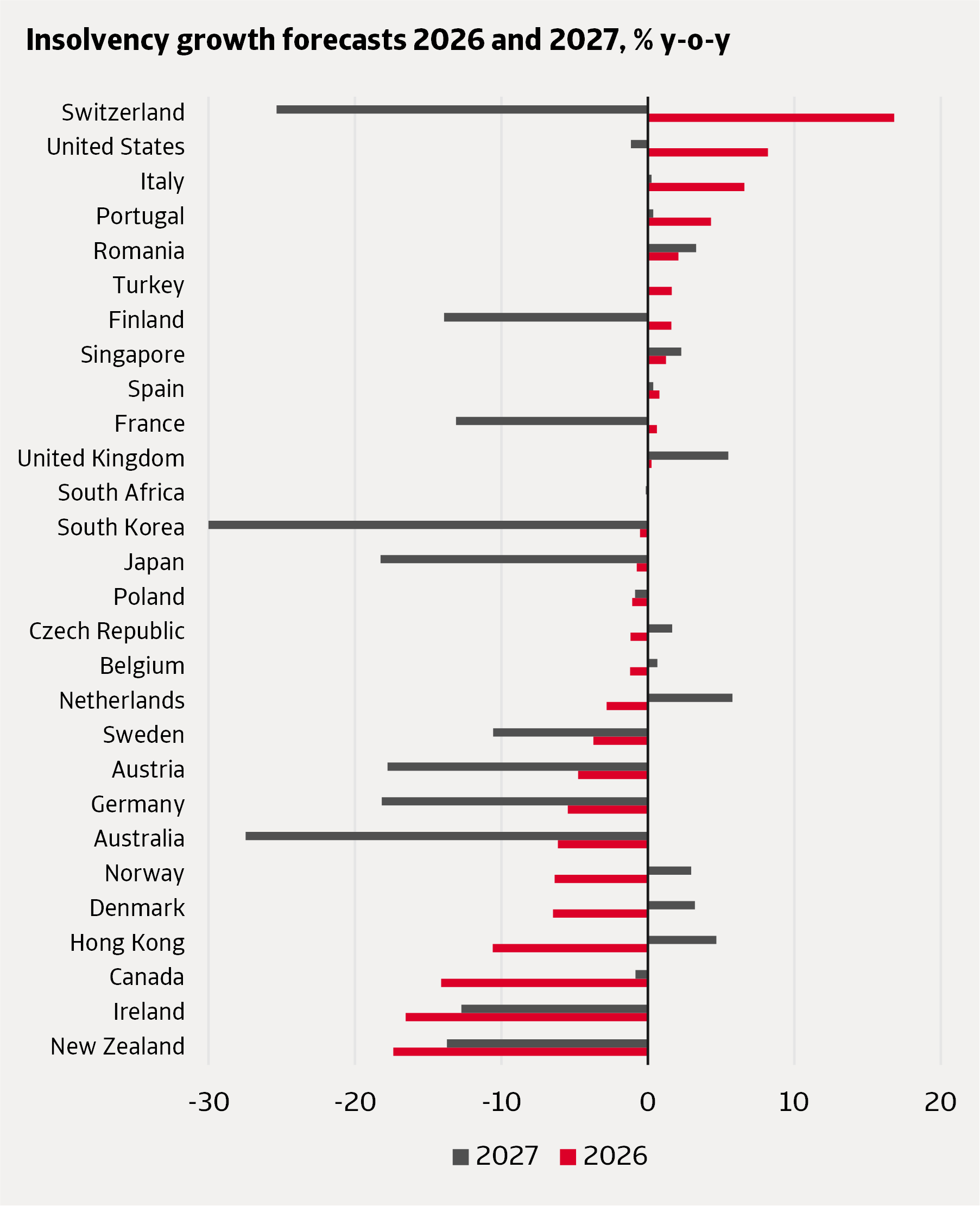 L’Europe présente des perspectives contrastées en 2026 : certains pays continuent d’enregistrer une hausse des défaillances d’entreprises, tandis que d’autres amorcent un recul. Les plus fortes augmentations sont attendues en Suisse, en Italie et au Portugal, tandis que les baisses les plus marquées devraient concerner l’Irlande, le Danemark et la Norvège.